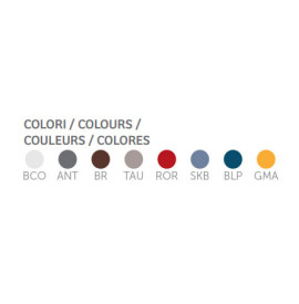 Colori: bianco, talpa, giallo, rosso oriente, azzurro cielo, blu petrolio, marrone e antracite.