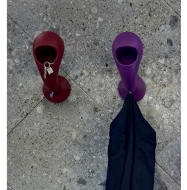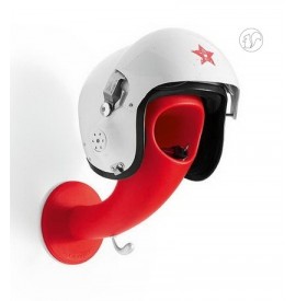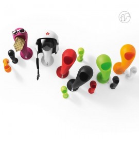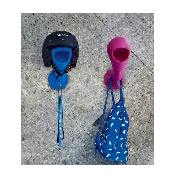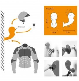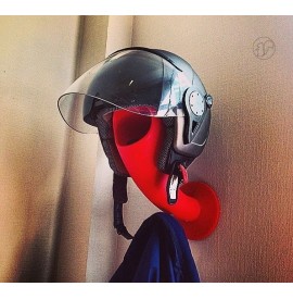 portacasco da parete con vano svuotatasche e gancio appendiabiti crazy head di Myyour in polietilene goffrato, La forma di testa arrotondata è pensata per mantenere le imbottiture del casco evitando deformazioni mentre la bocca è lo spazio dove lasciare le chiavi i guanti o il portafoglio ; sul collo si può appendere una sciarpa mentre il gancio sotto il collo per appendere la giacca o la tuta.