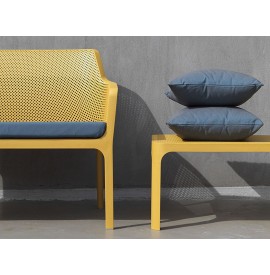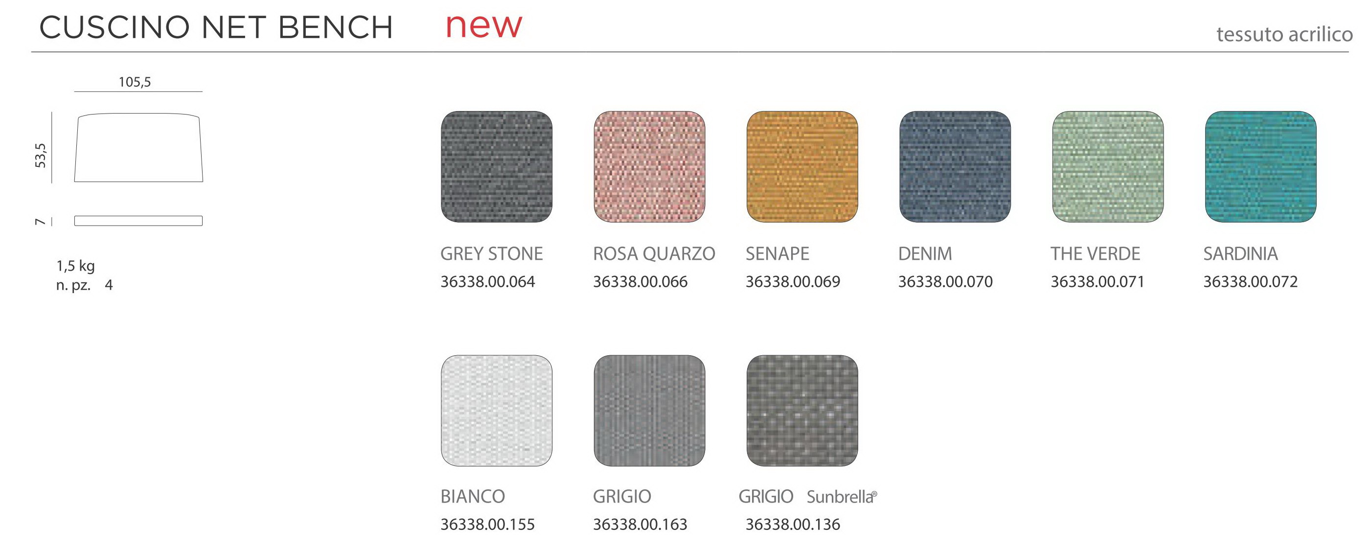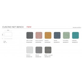 Ideale per panchina per esterno NET BENCH (vedi ACCESSORI).Tessuto Acrilico e imbottitura in poliuretano espanso nei colori :grey stone,rosa quarzo,senape,denim,the verde,sardinia,bianco,grigio e grigio sunbrella.