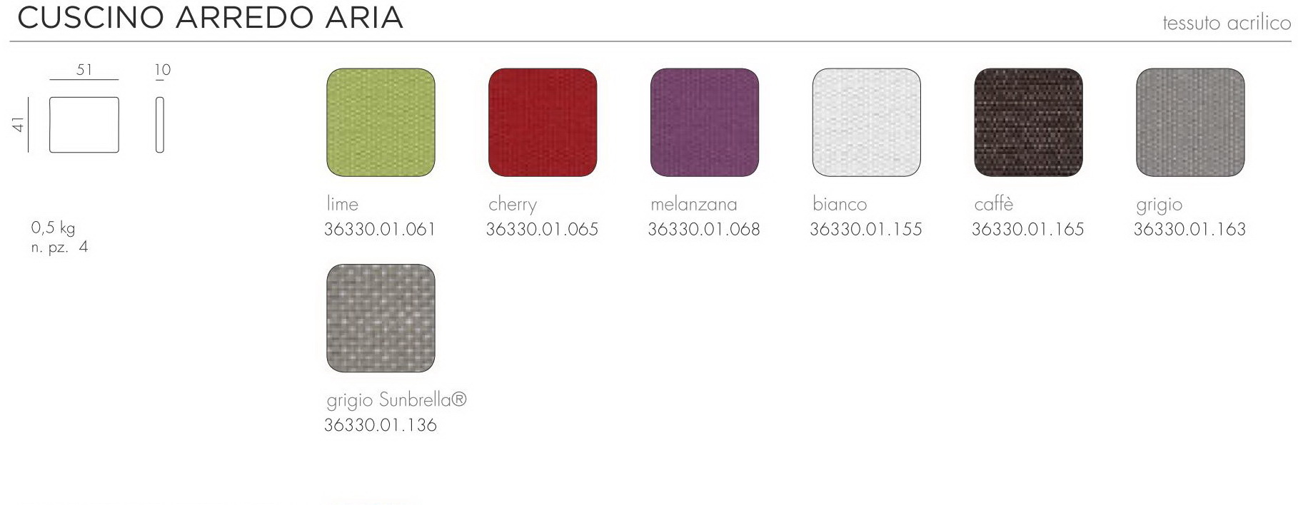 Ideale per poltrona per esterno ARIA (vedi ACCESSORI).Tessuto Acrilico e imbottitura in poliuretano espanso nei colori :lime,cherry,melanzana,bianco,caffè,grigio e grigio sunbrella.