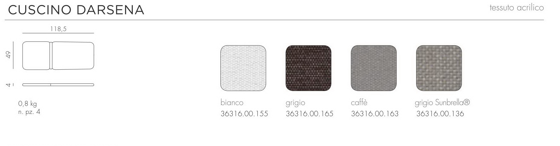 La seduta della poltrona DARSENA può essere ammorbitita con questo cuscino di tessuto 100% acrilico,resistente alla luce solare,sfoderabile con zip,lavabile in lavatrice a 30°,con trattamento antimacchia e antimuffa. Solo il tessuto GRIGIO SUNBRELLA ha il trattamento idrorepellente.Il cuscino vi accoglierà adattandosi perfettamente al vostro corpo. La particolare imbottitura renderà più piacevoli i vostri momenti di relax all'aperto.