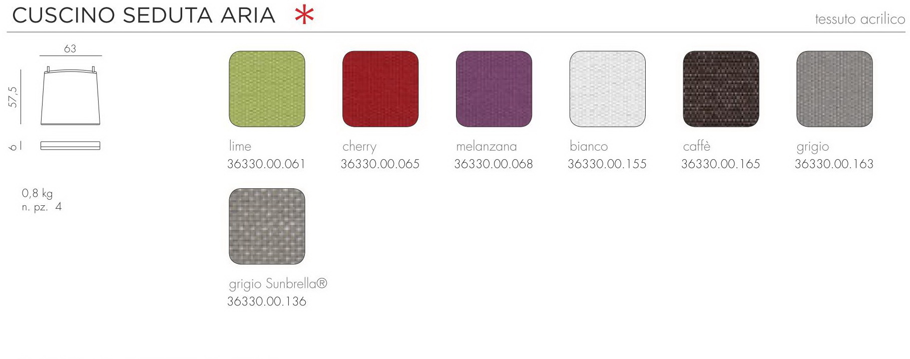 ORIGINALE NARDI OUTDOOR , La seduta della poltrona ARIA può essere ammorbitita con questo cuscino di tessuto 100% acrilico,resistente alla luce solare,sfoderabile con zip,lavabile in lavatrice a 30°,con trattamento antimacchia e antimuffa. Solo il tessuto GRIGIO SUNBRELLA ha il trattamento idrorepellente.Il cuscino vi accoglierà adattandosi perfettamente al vostro corpo. La particolare imbottitura renderà più piacevoli i vostri momenti di relax all'aperto.