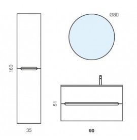 Composizione per bagno con mobile in polimerico a 2 cassettoni completo di lavabo in mineralmarmo, colonna sospesa e specchio rotondo diam. cm 80 retroilluminato.Misura cm 90 x 37/42,5 cm - colonna sospesa h cm 160