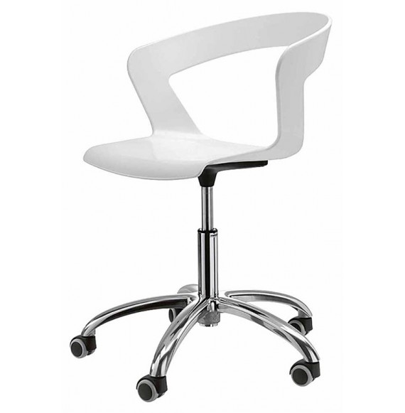 Poltroncina con braccioli in tecnopolimero bianco, avorio, verde, antracite,arancio,tortora e moka. Basamento centrale girevole in alluminio lucidato,regolabile in altezza,con ruote.