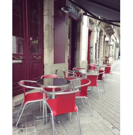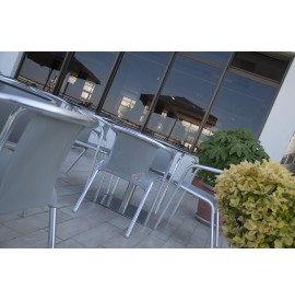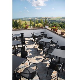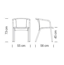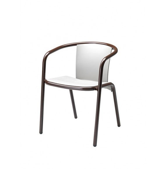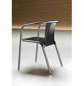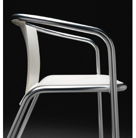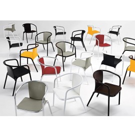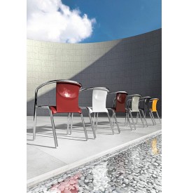 Sedia con braccioli, seduta e schienale in polipropilene nei colori: bianco, rosso moka, tortora, giallo e nero. Struttura in alluminio lucido o verniciato nei colori bianco e nero. Ideale per esterno.