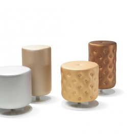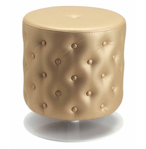 Pouf imbottito con basamento girevole in acciaio verniciato nei colori bianco, nero e grigio alluminio.Rivestimento capitonnè in ecopelle ignifuga in vari colori. Altezza cm 46 - diametro cm 42
