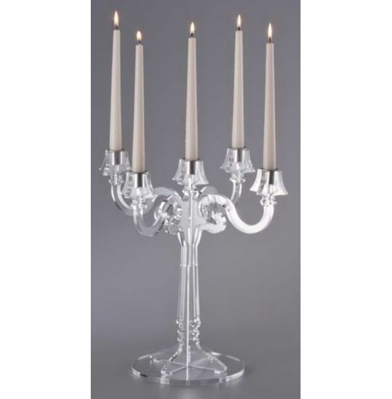 Candelabro in plexiglas trasparente per 5 candele . Dove viene inserita la candela c'è un supporto in metallo color alluminio che si può estrarre e pulire facilmente. Insieme al candelabro puoi acquistare le nostre candele speciali colorate che non gocciolano. Una confezione è composta da nr.12 candele.