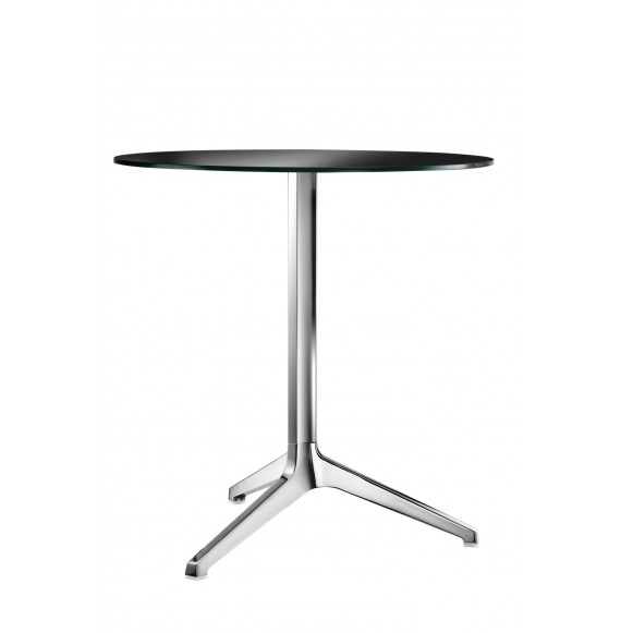 Tavolo ideale per l'uso in esterno grazie alla base in pressofusione di alluminio che lo rende leggero e resistente alle alte temperature estive e agli agenti atmosferici. la base è disponibile nelle finiture: alluminio anodizzato o lucidato. il Piano rotondo Ø 69 cm in stratificato di colore bianco .Dimensioni: base ø 66 cm, piano ø 69 cm altezza 74 cm
